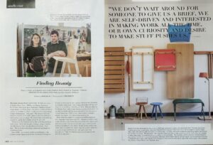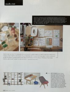 Both John and Wonhee have art backgrounds and like to work with their hands to shape new designs. They frequently build physical prototypes and sketch together as a way to generate ideas. “Sometimes we make small paper models as a quick way to explore form and proportion, or to figure out if a chair is stackable,” says Wonhee. “We make our students make them, too. They usually say, ‘Oh, cute!’”