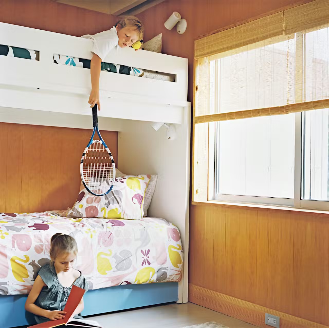 There are several spots where space is “borrowed” from an adjoining room—where a build-out in one room creates a recessed storage nook on the other side of the wall. A tiled shower seat in the master bath, for example, translates into an inset bookshelf in Emily and Henry’s room. The dialed-in detailing continues in the hallway, where shelves are narrower at the top and deeper at the bottom to accommodate board games and oversize kids’ books.