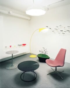 The studio’s front room is a makeshift showroom, open to the public three days a week. On view are Förster’s yellow Circle lamp (bent sheet metal with a matte rubber finish), a mauve Spoon chair inspired by Japanese spoons, the Umbrella pendant lamp, Mix bowls and vases made of crystal and plastic, and three low pieces—the Cake table, the Breeze coffee table, and the asymmetrical Drop stool.