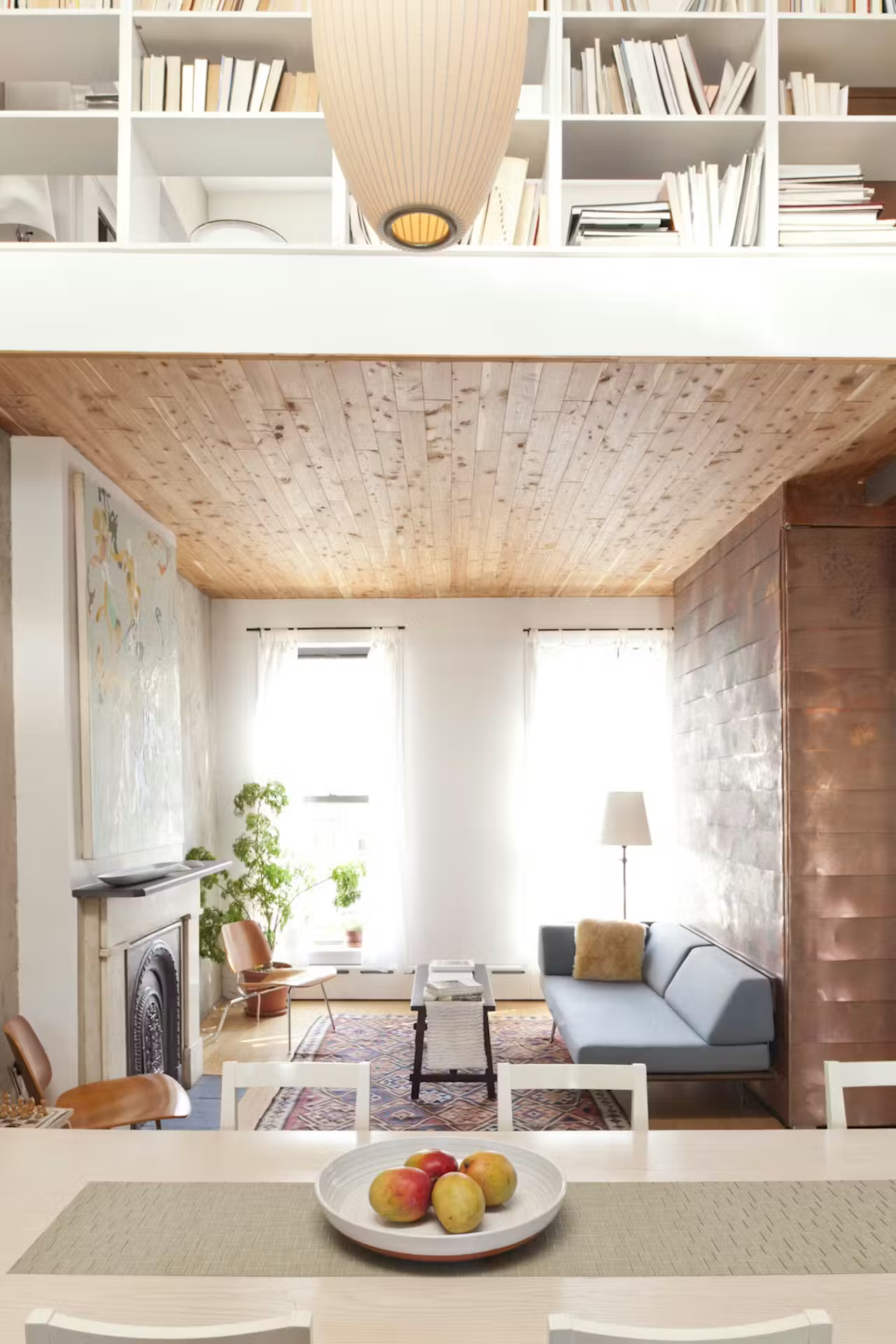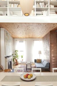 After I decided to cut that giant hole in the center, the room configuration quickly laid itself out. The kitchen went in the back, the living room in the front, and the two-story space became the dining room. Upstairs, there’s a bedroom in the front, a bedroom in the back, and a catwalk connecting the two. I also wanted to separate the living room from the foyer and to activate the full height of the space, so I built a volume that contains storage space and extends from the first floor to the roof. I covered it in inexpensive copper flashing so it would read as a single object.