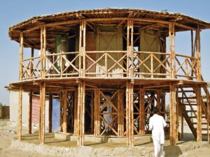 In the aftermath of a 2005 earthquake in the Hazara and Kashmir regions of Pakistan, Lari came up with a bamboo shelter system called KaravanRoof that is designed with low costs and a low-carbon footprint. The structures are typically built with adobe-and-mud walls and strong bamboo cross bracing—all of which are raw materials available locally and suited to both rural and urban areas.